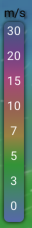 예를 들어, 0m/s는 파란색이고, 5m/s는 연두색, 7/m는 주황색, 15m/s는 자주색이라는 걸 표현하고 있습니다.