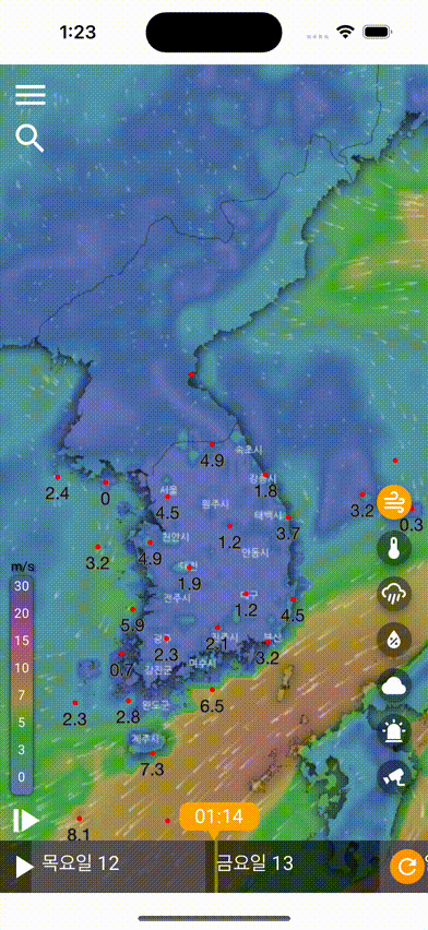 바람 애니메이션과 지도에 칠해진 색으로 바람의 방향과 세기를 한눈에 파악할 수 있습니다.