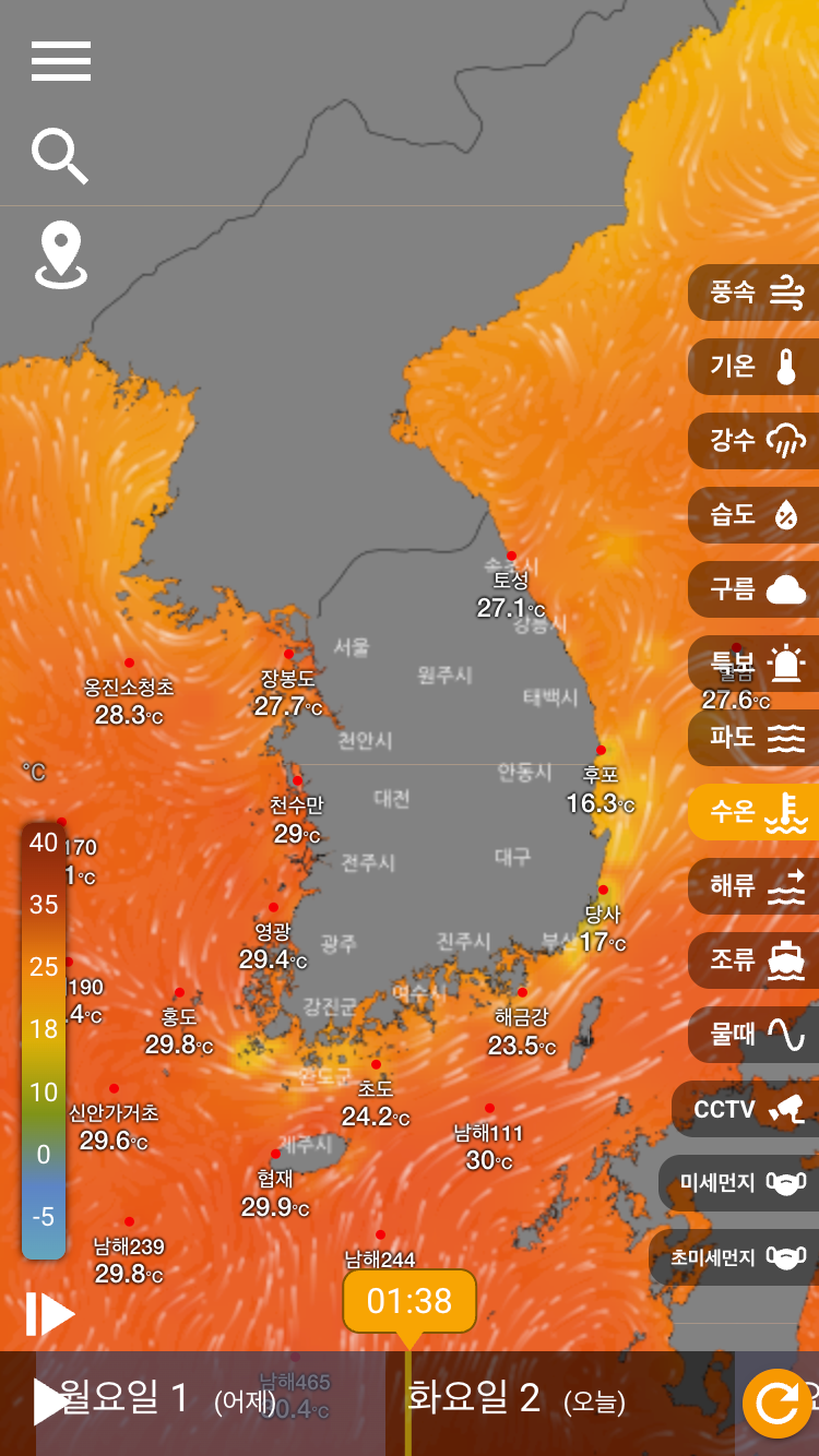 웨더나우는 전국에 설치된 해양관측소 데이터를 기반으로, 실시간 바다 수온을 지도 위에 표시해 주는 서비스입니다.