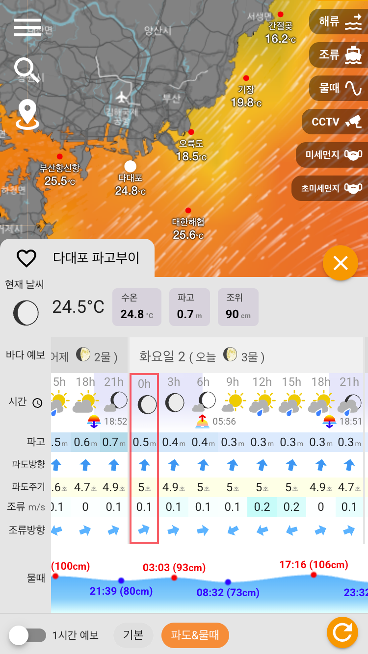 관측소를 클릭하면 물때, 파도, 조류 예보까지 한 번에 확인할 수 있어, 낚시, 요트, 서핑 같은 해양 레저 활동을 준비할 때 아주 유용합니다.